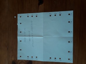 i. El cartón-matriz se pliega dos veces, para obtener cuatro cuadrantes y de tal manera que el cuadrante en el que hemos identificado los seis puntos para perforar sean visibles.